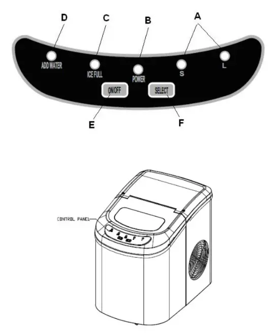 F. Button to select ice cube size.