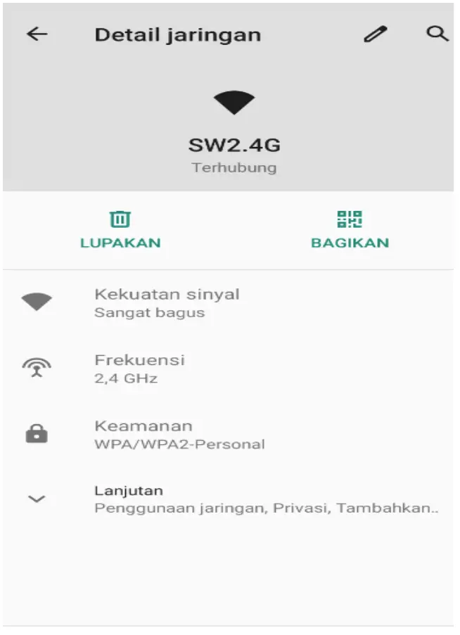 ), and the approximate signal strengthen (the number of lit bars).If touch the connected network, will display the name of Wi-Fi network, status ,speed ,signal, strength, security, information and IP address.
