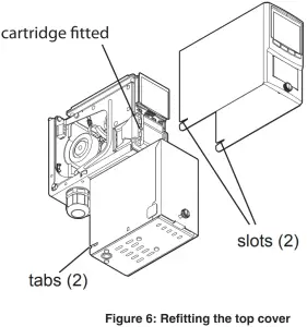 - Set the power switch to the “on” position. 6. Refit the ventilated top by aligning the slots on either side with the locating tabs on the mounting bracket assembly and pushing the cover horizontally until seated.