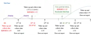 - Whenever the device sends a report, no matter resulting from data variation, button pushed or MaxTime interval, another cycle of MinTime/MaxTime calculation is started.