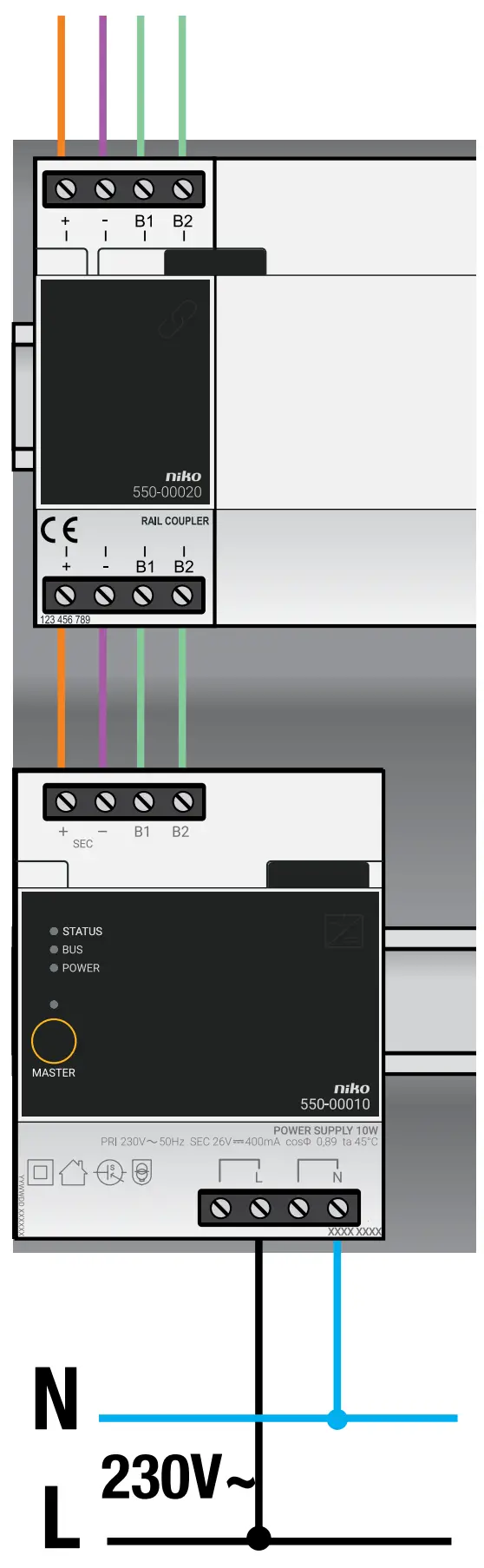 - provides power to modules and controls in installations fitted with a controller 550-00001 or provides extra power in installations where the power supply integrated in the connected controller is not sufficient
