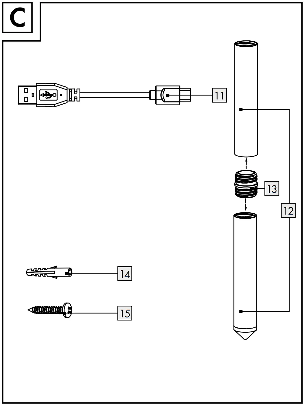 comes in three parts (see Fig. C), but for low installation heights, one part can be used on its own. Never place the product directly onto the ground: it can be flooded in heavy rain. - Push the point of the ground spike