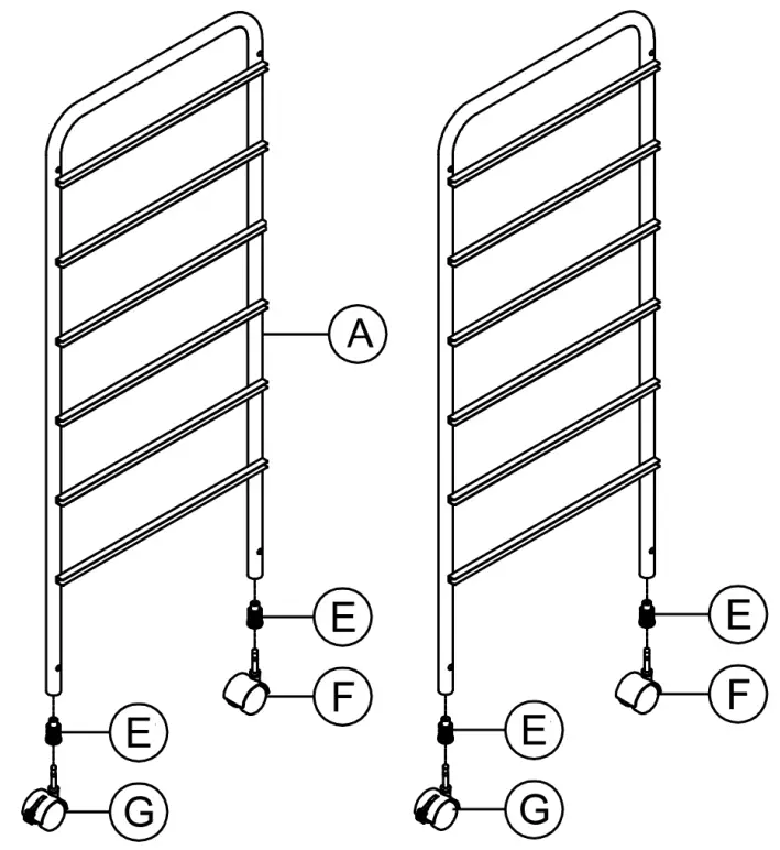 Push CASTERS (F) and LOCKING CASTERS (G) into the SLEEVES (E) until click is felt.