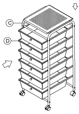 Slide the DRAWERS (D) into the channels and clip the SHELF (C) onto the crossbars.
