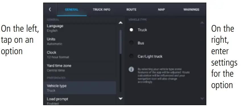 ❾ Settings: General, Truck Info, Route, Map and Warnings.