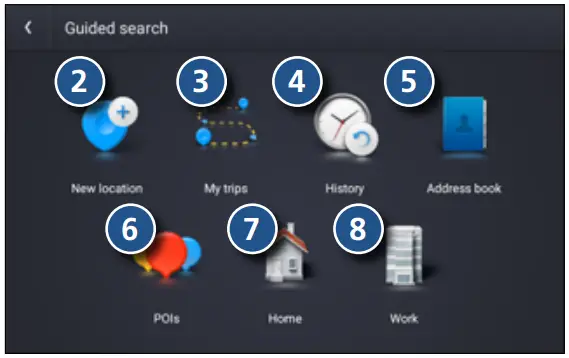 - View saved locations by tapping Where to? > Guided Search > Address book > Bookmarks.