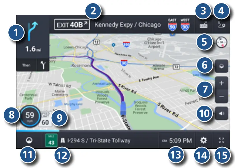 ⓬ Current street name, upcoming intersection, or current location.
