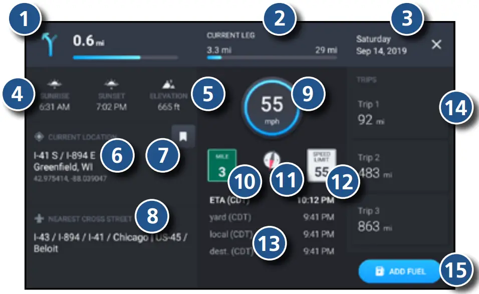 ⓮ Trip information for up to three trips. Includes odometer settings, hours and speeds.