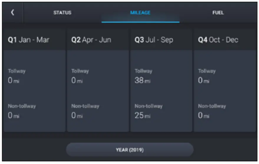 - Tap the Fuel tab to view a list of fuel logs by quarter.