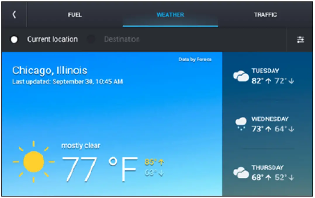 Note: These features require a Wi-Fi connection. To access fuel prices, weather and traffic, tap the Wi-Fi connected services button