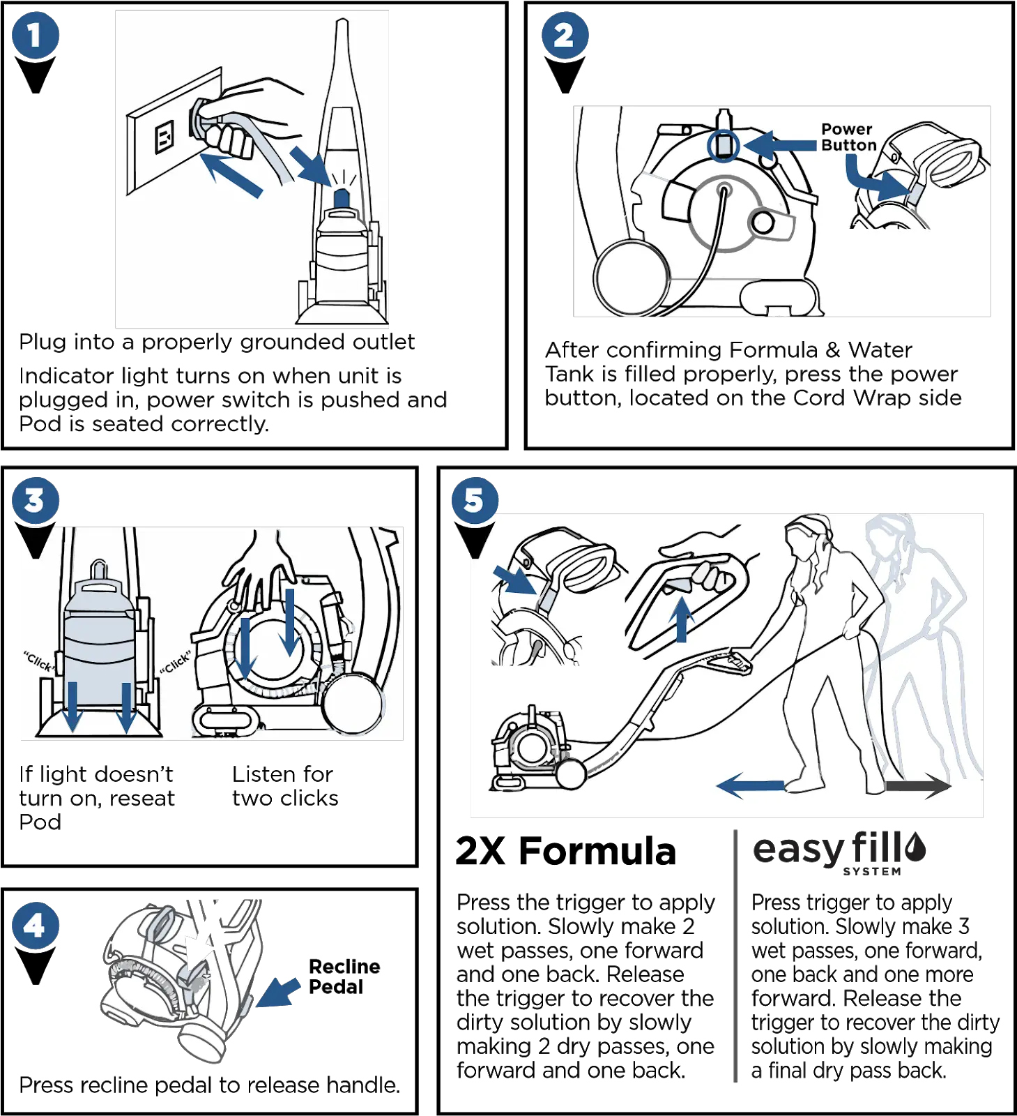 Keep plenty of genuine BISSELL 2X* formula on hand so you can clean and protect whenever it fits your schedule. | Always use genuine BISSELL deep cleaning formulas. Non-BISSELL cleaning solutions may harm the machine and will void the warranty. | ||||||||||||||||