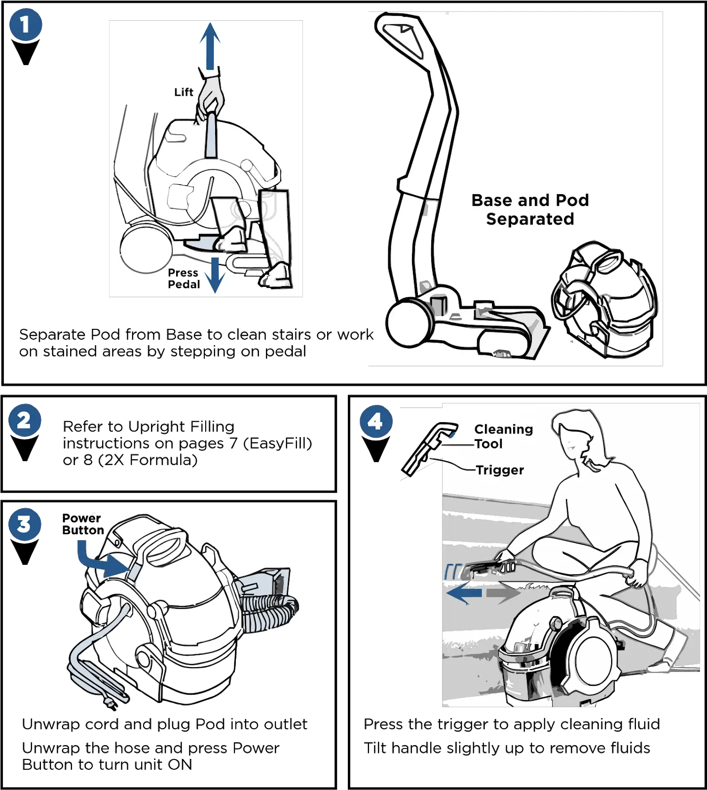 The portable spot cleaner is not attached completely | Make sure the portable spot cleaner is attached. Push down firmly to check (see “Tip: Attaching the Pod” on page 7 OR step 3 of page 9 for detailed instructions) | |