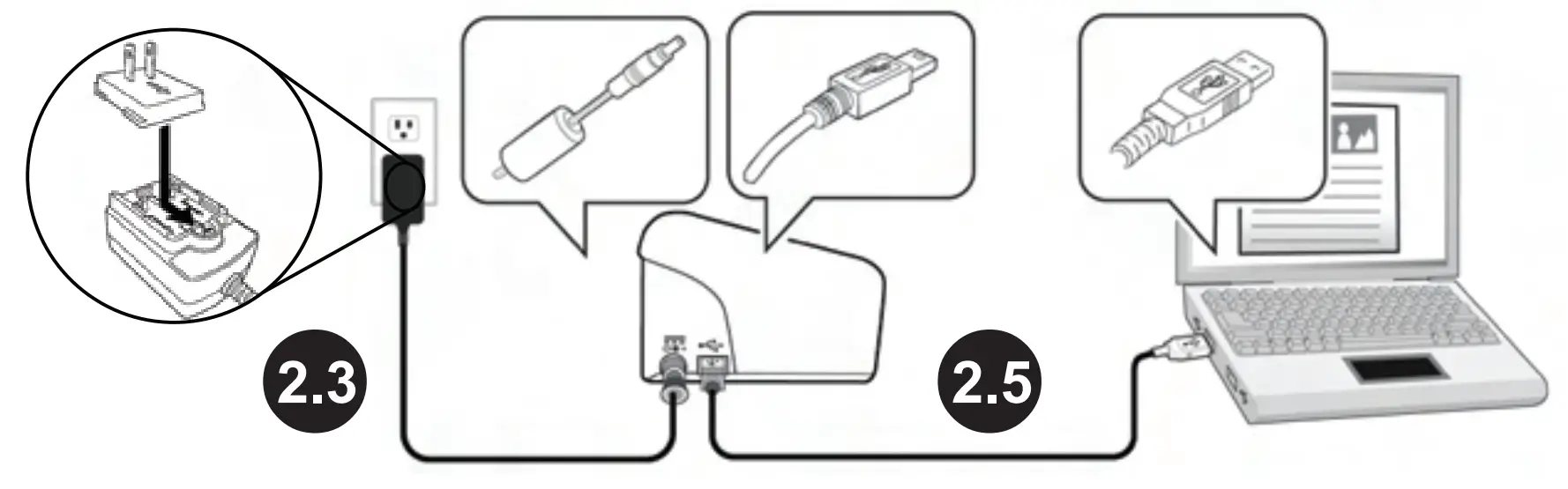 2.3 Plug the small end of the power adaptor into the power jack of your scanner. Insert the other end to an appropriate power outlet.