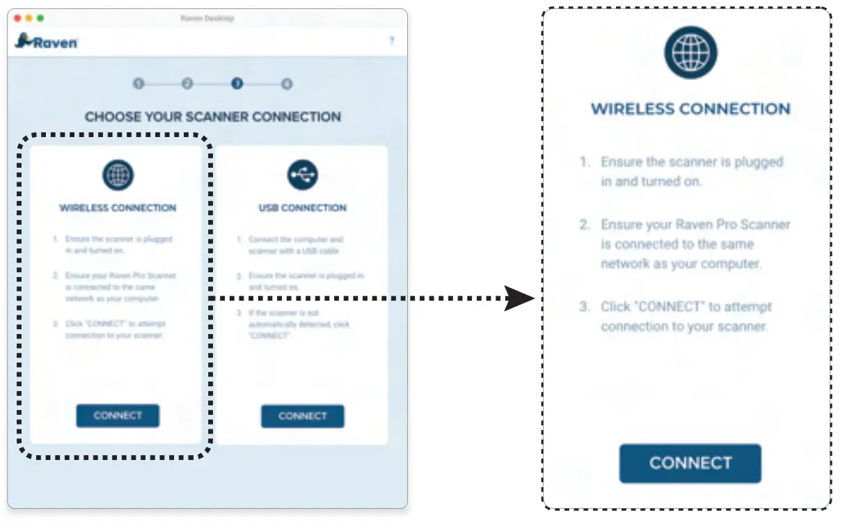 2.5 For USB connection, connect the micro-USB end of the USB cable into the micro-USB port on your scanner. Plug the rectangle end to the USB port at the rear side of your computer. For WiFi connection (optional), proceed with Raven Desktop installation and follow steps shown.