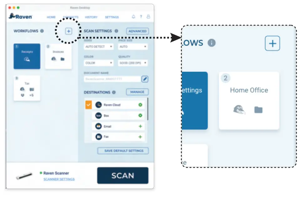 - 4.1 Home screen shows available workflows, scan settings and destinations. Create custom workflows by clicking the button.