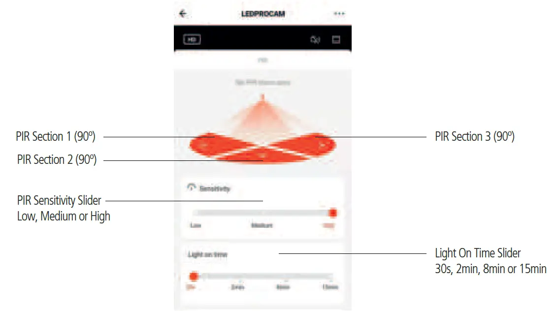 PIR: This function allows you to set the sensitivity level of the PIR as well as the time-out duration for the attached LEDPRO floodlight.