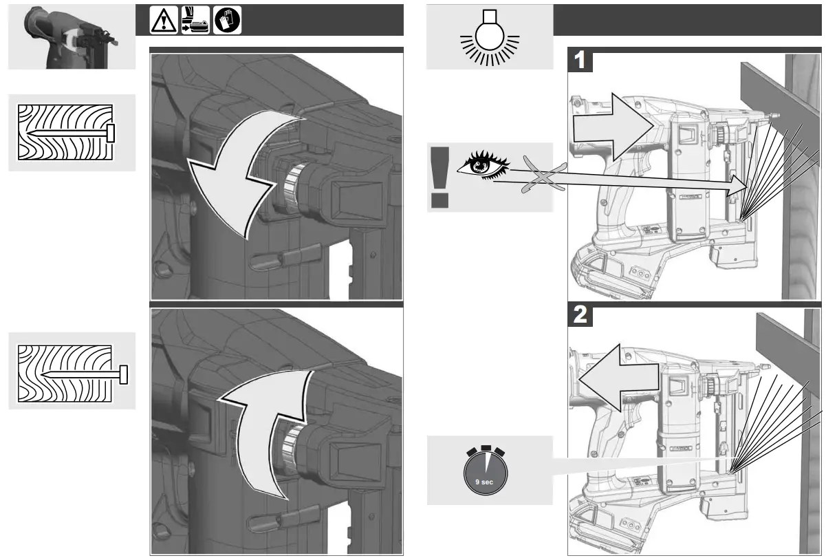 Do not actuate the tool unless the tool is placed firmly against the workpiece. If the tool is not in contact with the workpiece, the fastener may be deflected away from your target.