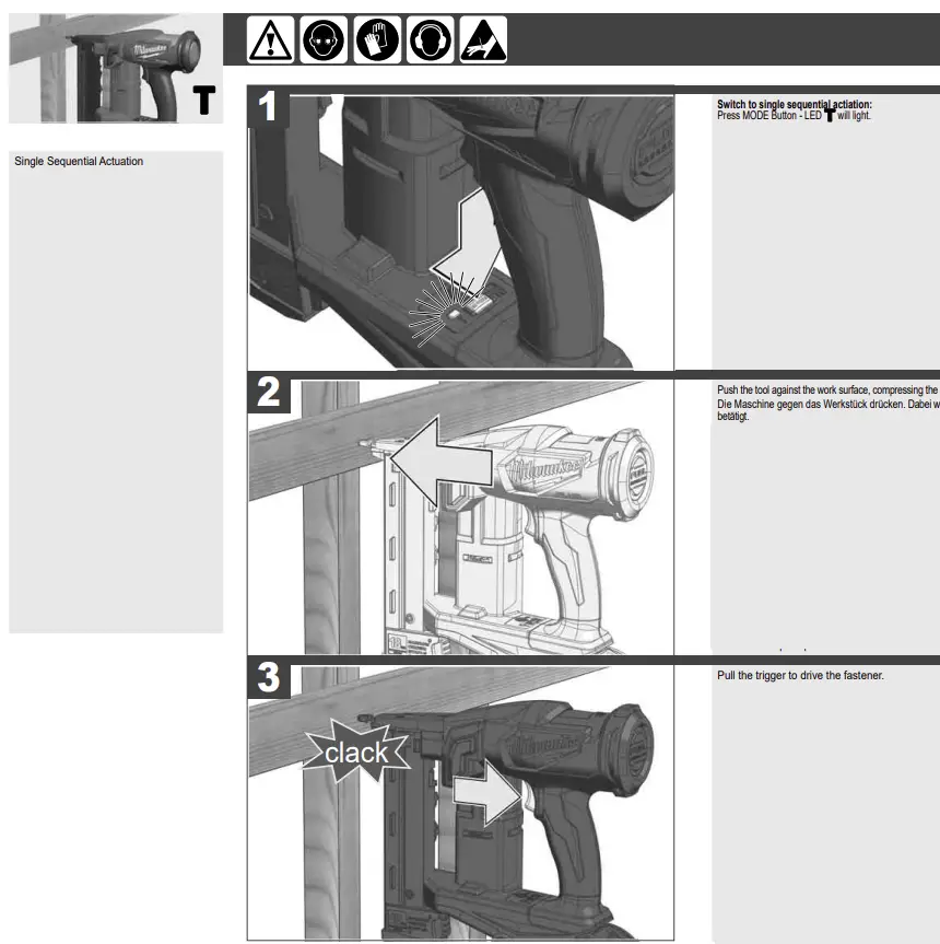 - Select the Single Sequential Actuation Operation. Without pulling the trigger, pull back the fastener pusher on the magazine (to override the Reload Indicator) and press the workpiece contact against a workpiece. The tool must not operate. Holding the workpiece contact away from the workpiece, pull back the fastener pusher on the magazine (to override the Reload Indicator). Pull and hold the trigger for 5 seconds. The tool must not operate. Continue to pull and hold the trigger and push the workpiece contact against a workpiece. The tool must not operate. Without pulling the trigger, pull back the fastener pusher on the magazine (to override the Reload Indicator) and press the workpiece contact against a workpiece. Pull the trigger. The tool must operate. Release the trigger. The driver must move up.