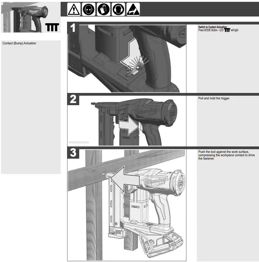 - Select the Contact Actuation Operation. Holding the workpiece contact away from the workpiece, pull back the fastener pusher on the magazine (to override the Reload Indicator) and pull the trigger. The tool must not operate. Continue to pull and hold the trigger and push the workpiece contact against a workpiece. The tool must operate.