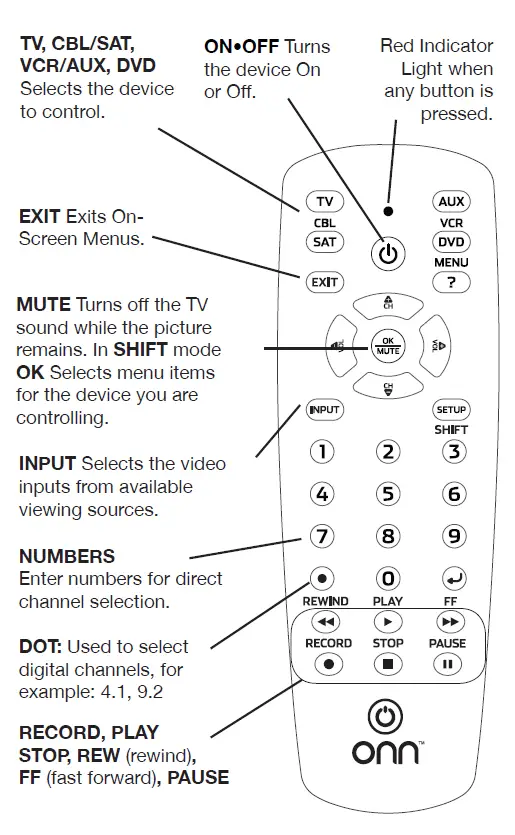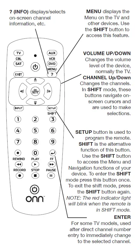 Your ONN universal remote control is designed to control up to 4 different audio/video devices such as TV, DVD, VCR, satellite, cable and audio using only one remote. To use this remote, you will need to program it to control the devices of your choice. There are two ways to program the remote – direct code entry or auto code search.