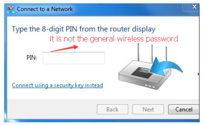 1 ) Sometimes it will ask you to type in a PIN number when you connect to the wireless network for the first time. This PIN number is different from the Wireless Password/Network Security Key, usually you can only find it on the label of your modem router.
