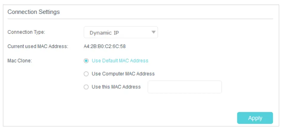 You can manually change the MAC address of the modem router. It is helpful when your Internet access account provided by your ISP is bound to one specific MAC address, in other words, your ISP just permits only one computer with the authenticated MAC address to access the Internet. In this case, you can use MAC Clone to allow more computers to access the Internet via the same account.