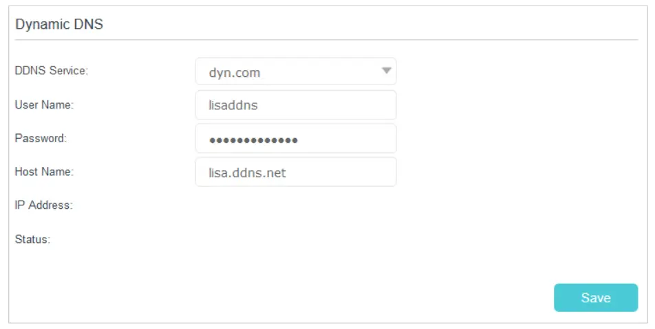4 Enter the username, password and host name (domain name) of the account (such as lisa.ddns.net).