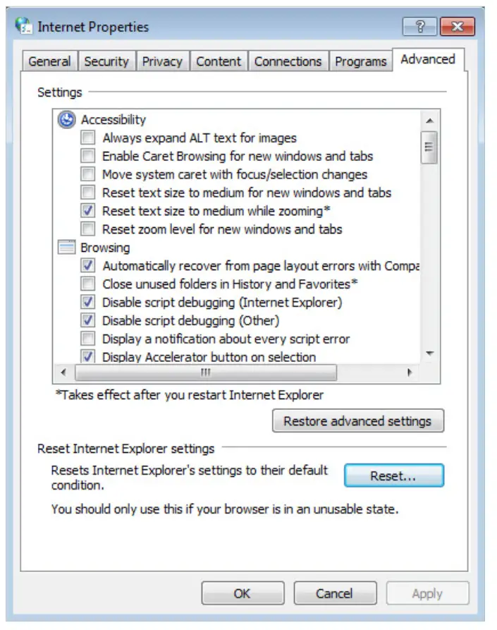 5 ) Go to Advanced > Restore advanced settings, click OK to save the settings.