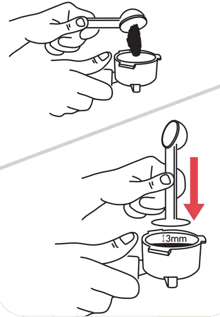 | Dosage | Not enough grinds. Use more grinds. | 3mm below the top of the filter basket after tamping | Too many grinds. Use less grinds. |