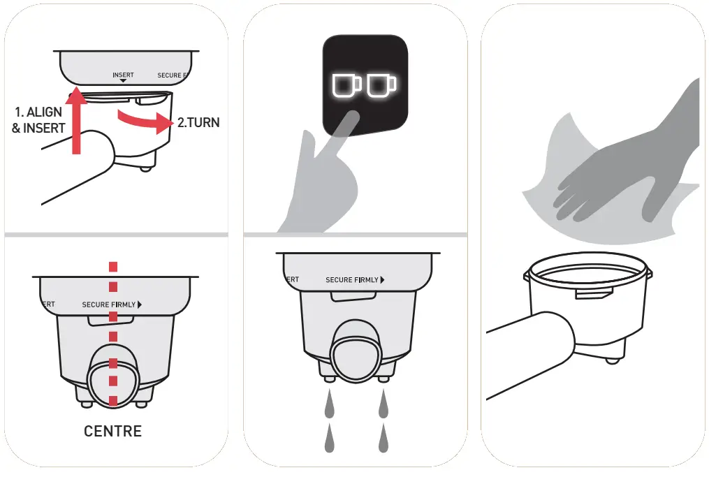 Insert group handle into group head. Press 2 CUP button. Wipe filter basket with a dry cloth.