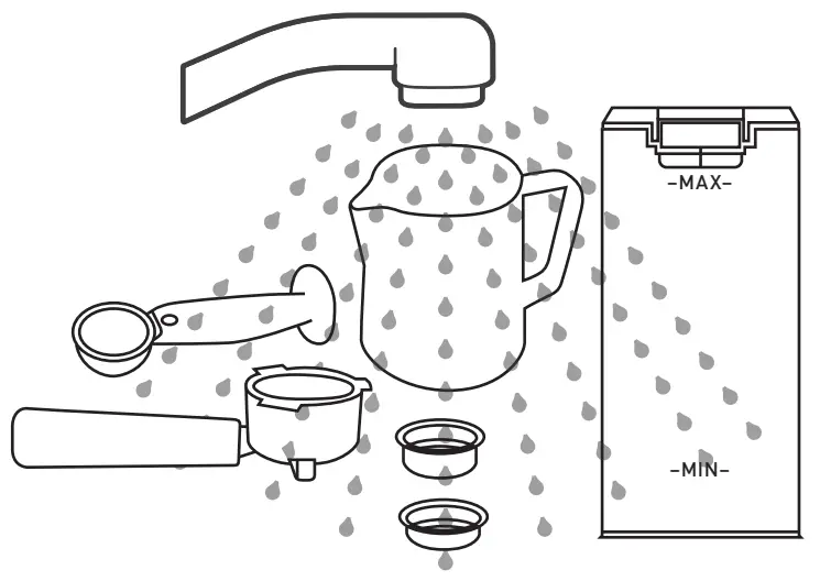 Wash the water tank, milk jug, group handle, tamper measuring spoon, 1 CUP & 2 CUP filter baskets in warm water with a milk detergent. Rinse and allow thorough air drying