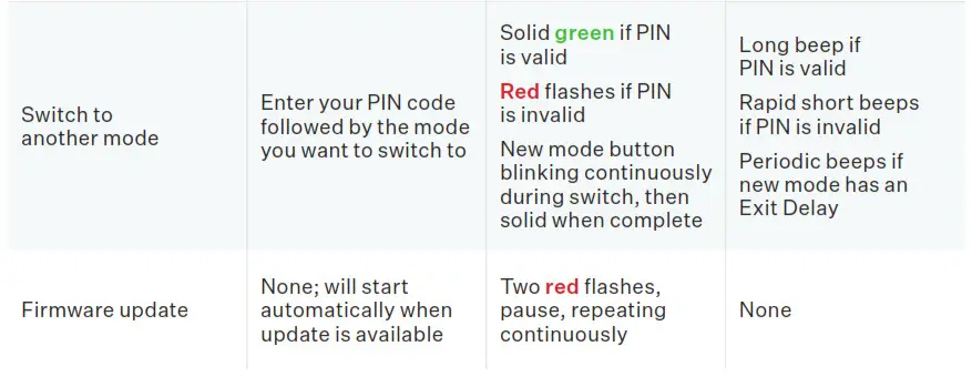 You can switch modes by simply entering your PIN code, followed by the mode you want to switch to. If the PIN code you entered is valid, the Ooma Keypad will play a long beep and will display a solid green light. Otherwise, the Ooma Keypad will blink red and play three short beeps if the PIN is invalid.