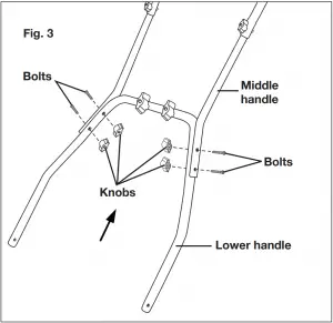 - Secure the two middle handle bars to the upper handle using the first set of knobs and bolts provided. Tighten the knobs on each side to ensure a secure fit (Fig. 1).