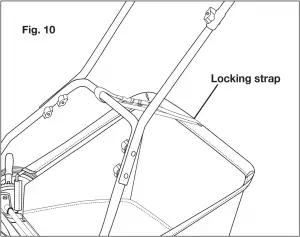 Adjust the strap to an appropriate height so that the grass catcher does not rub against the ground while mowing or transporting the unit (Fig. 10).