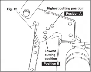 - To adjust the reel to the lowest cutting position, place the adjustment knobs through the bottom hole (position B) located on the side of the frame (Fig. 12).