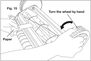 - Using one of the twenty pieces of paper provided, insert one of these pieces of paper between the cutting bar and the reel blades, then slowly turn the wheel by hand (Fig. 15).