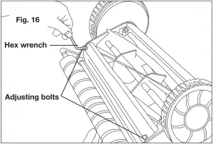 - If the mower cuts the paper intermittently, use the hex wrench provided to tighten the adjustment bolt closest to where the intermittent cut was observed. Tighten the bolt on the appropriate end of the cutting bar by turning it clockwise approximately 1/8th of a turn until the reel blades make contact (Fig. 16).