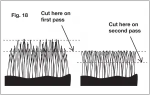 - For extremely tall grass, set the cutting height at the mower’s maximum setting for the first pass, and then reset it to the desired height and mow a second or third time (Fig. 18).