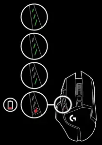 –– Charge level can be checked when the mouse is powered on or by pressing the G9 button or using Logitech G HUB to assign a button to check charge level.