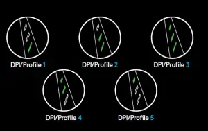 DPI/Onboard profiles are shown using three LEDs above the thumb buttons. The illustrations above shows which values