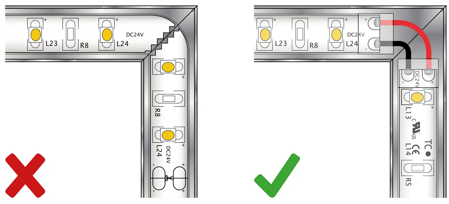 Do not bend de LED strip to adapt them to sharp radius or angle, cut for the cut mark and weld a section of cable to make the turn.