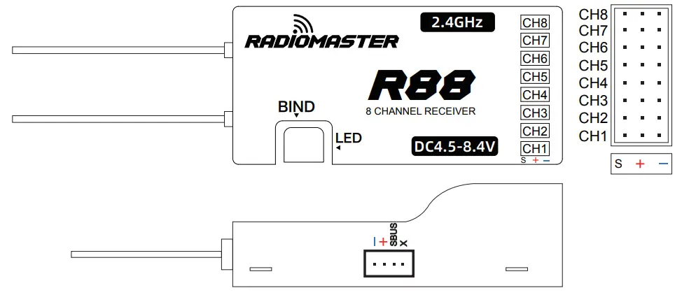 This receiver has a total of 8 PWM channels + 9 SBUS Channels (Sbus has 8 control channels + 1 RSSI channel). Channels 1-8 are controlled by the remote controller, the 9th channel is the signal strength RSSI value output by the receiver, which can be read by various flight controllers and sent to the OSD to Show signal strength in the FPV video feed.
