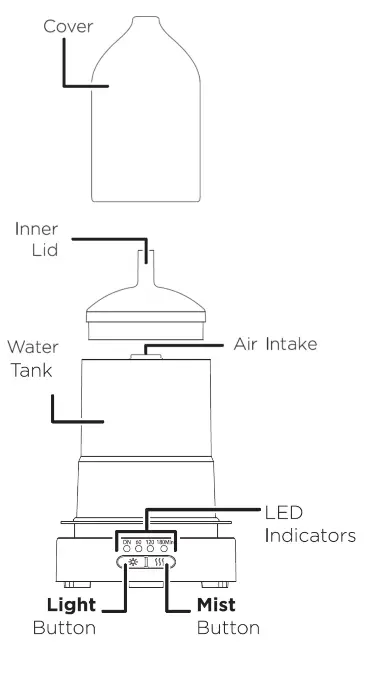 - Do not block the mist diffuser outlet or the air intake located at the bottom of the product.
