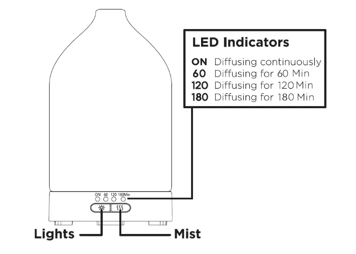 • Press the mist button a 3 rd time and the diffuser will operate for 120min before shutting off.