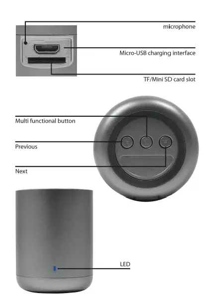 To go from headphone to AUX mode, press and hold the M button. You can link your speaker to outside media players here. This connector is intended for charging purposes; it cannot be used to connect external devices. To switch between Bluetooth and AUX modes, press this button.