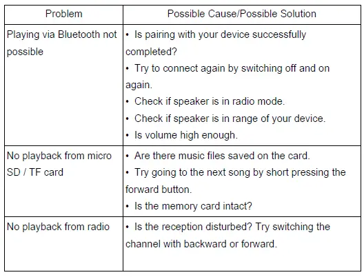 Before using the radio function, connect the charging cable to the speaker. The speaker must be switched off and the other end of the cable must not be connected to anything! It will work as antenna. Switch on the speaker and activate radio function by double pressing the MFB. Station scanning will be activated by pressing the forward and backward button simultaneously. The scan is finished when the channels stop changing automatically. To change the channel short press forward or backward. Adjust volume by long pressing the forward and backward buttons. To switch back to Bluetooth mode double press the MFB.