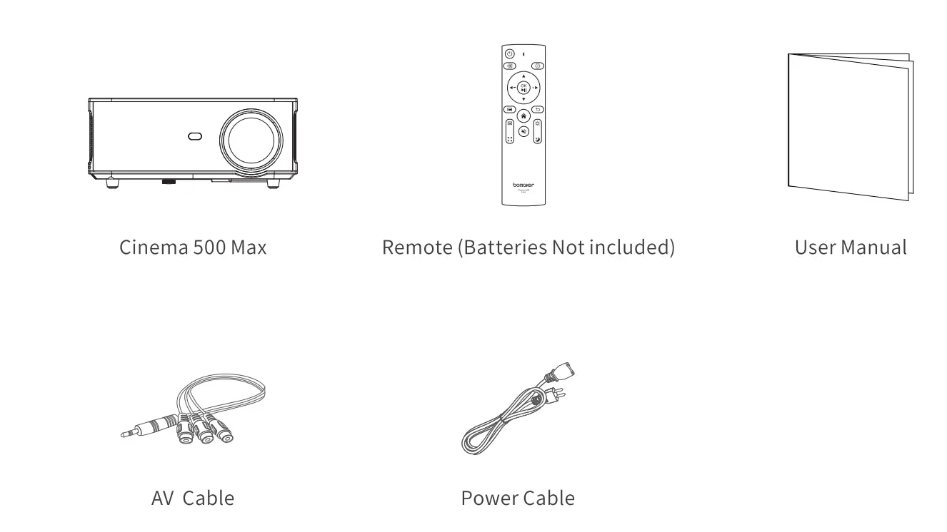 Thank you tor purchasing the bowmaker Cinema s00 Max projector. Please read this manual thoroughly before using it and keep it for the Tuture reference. It physical injury, loss of data, or damage is caused by failure to follow instructions, the warranty does not apply. Set Up Do not install the projector in places without proper ventilation. Do not install the projector in hot and humid places. Do not install the projector in dusty or smokey places. Do not block the ventilation holes intake or exhaust). Do not install the projector near the temperature and smoke detectors. It may cause a sensor failure. Do not install the projector in areas where warm dnd cool di w doW y otherwise it may cause projector failure due to moisture condensation or large temperature changes. Power Supply Power off the device before removing the power supply from the socket. Use the power cord with caution to avoid unduly bending it. Damaged power cords may cause electric shock or fire. Unplug this device if there are lightning storms or when unused for a long period of time. Never touch the power cable or the power connection with wet hands. Unplug the power cord from the outlet after using the projector. Repairs Ne NE duy iepeas to ie projector yourself. No components in the projector can be repaired by customers. * Please entrust qualified professional maintenance personnel for repair. Caution Do not look at the lens or it may cause severe eye injury. During and after use, the temperature near the outlet will rise. Therefore touching it may cause burns. Do not place the projector in too warm or too cold a room, because the high-temperature or low-temperature will shorten the lifespan of the device. The working environment would be 5’C-35’C better.
