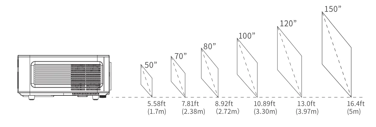 The minimum projection distance of the projector is 1.7 m (50 inches). Projection distance: 1.7m–50 inches, 2.3–70 inches, 2.7m–80 inches, 3.3m–100 inches, 5m–150 inches, please refer.