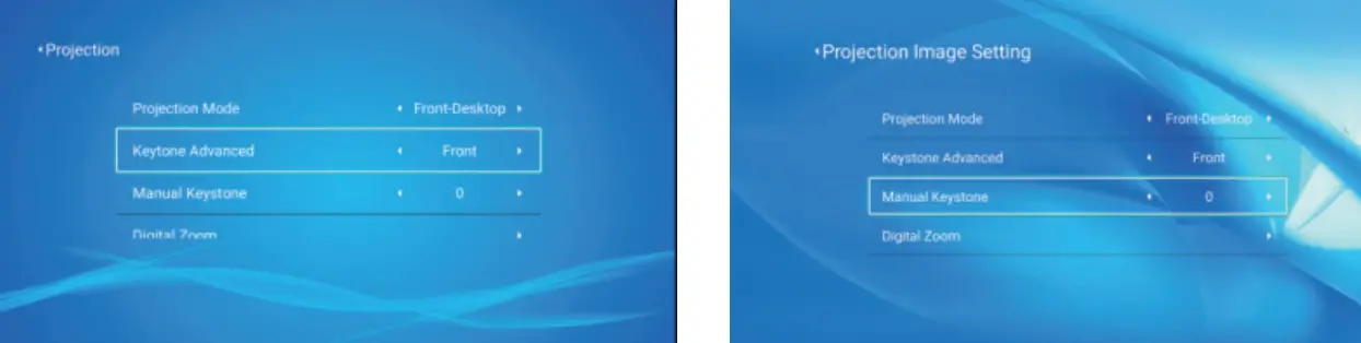 - Step 2: Select the Projection image setting press OK to enter, select [Front] in the [Keystone Advance] column, and then press the down button on the remote control to enter manual keystone correction.