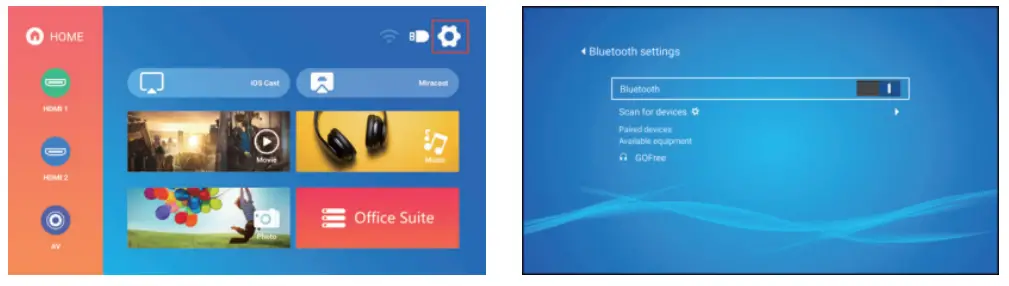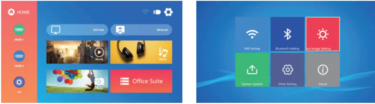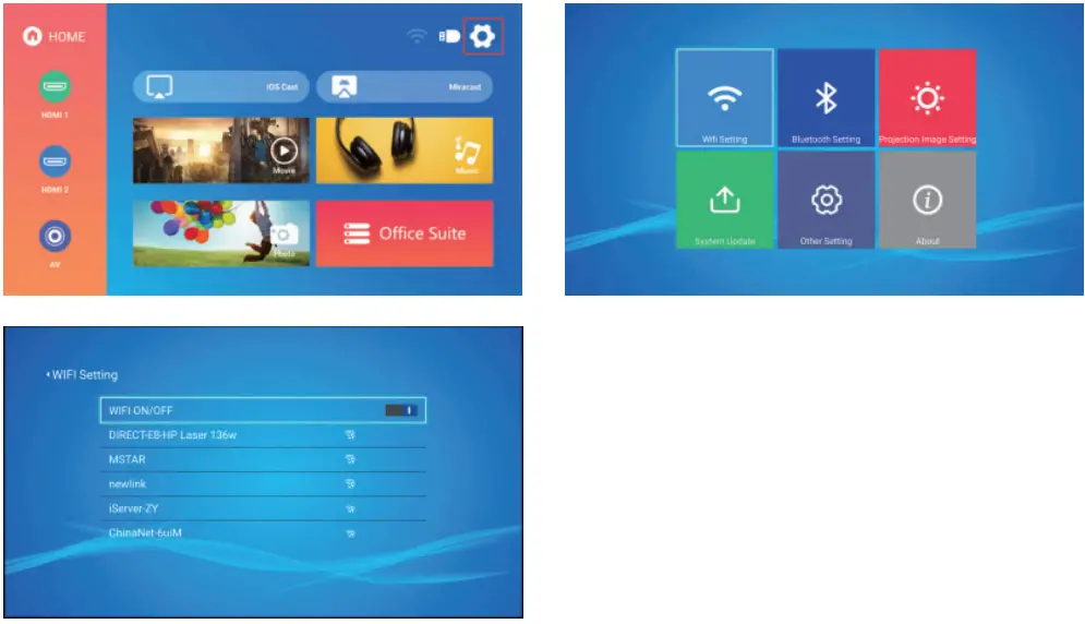 - Step 1: Use the remote control or projector button to enter the setting interface at the upper right corner of the projector’s main interface